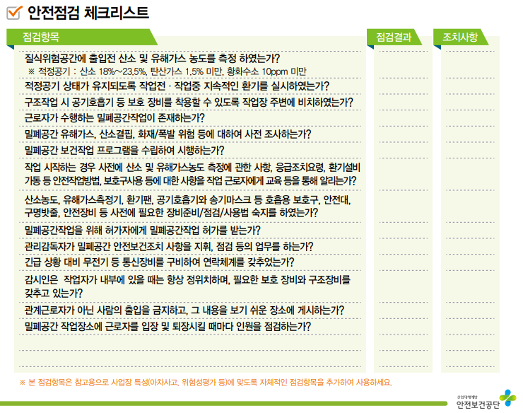 밀폐공간 안전점검 체크리스트는 다음과 같습니다(작업 전 안전점검 밀폐공간 작업, 안전보건공단, 2015).