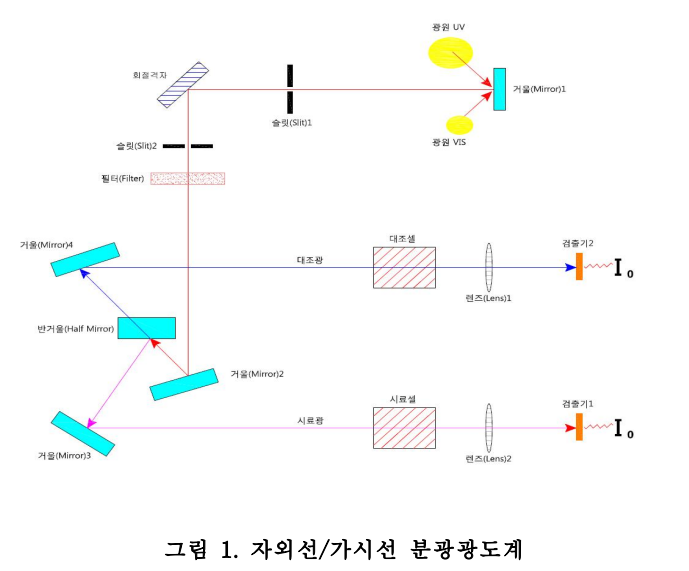 자외선/가시선 분광광도계(UV/VIS, ultraviolet visible spectrometer)는 아래 그림과 같이 광원부, 파장선택부, 시료부 및 측광부로 구성되어 있고 빛 경로길이가 1 cm 이상 되며, 570 nm의 파장에서 흡광도의 측정이 가능하여야 합니다(ES 07351.1b 토양오염공정시험기준 불소-자외선/가시선 분광법 3.1).