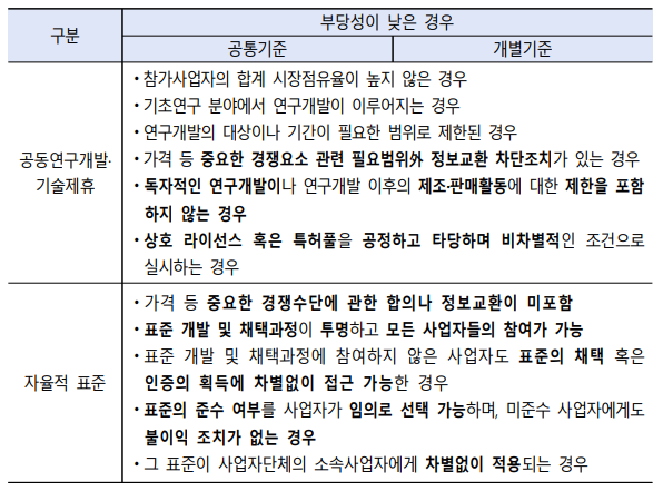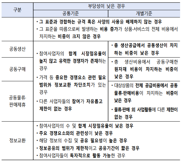 환경적 지속가능성을 목적으로 하는 합의의 유형을 공동연구개발·기술제휴, 자율적 표준, 공동생산, 공동구매, 공동물류·판매제휴, 정보교환 등 총 6가지 유형으로 구분