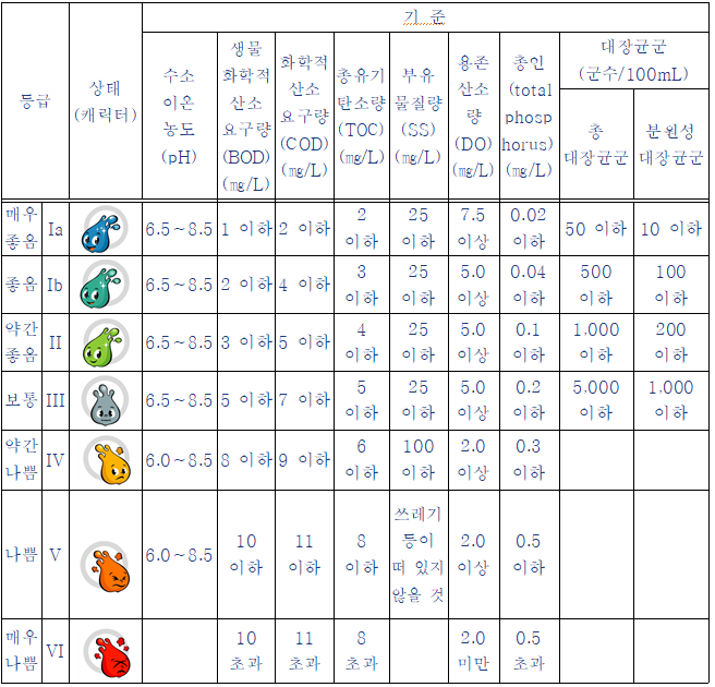 | 등급 | 항목 | 기준(㎎/L) |