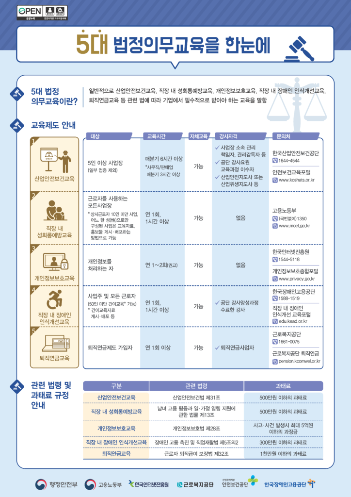 기업에서 필수적으로 받아야 하는 5대 법정교육에 대해 살펴보겠습니다.